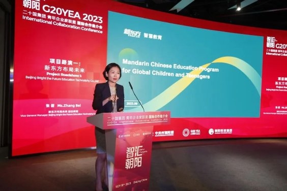 近日,智汇朝阳G20YEA国际合作推介会在国际创业投资集聚区举办。新东方智慧教育总经理柴明一、副总经理张蓓作为青年企业家代表受邀出席此次活动,张蓓女士作为首位项目宣讲嘉宾进行开场,并以“面向海外青少年及儿童的中国文化学习教育”为主题做精彩介绍。