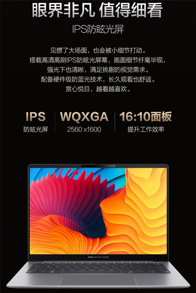 作为我们与网络世界的互动窗口,这款破晓6 Pro在显示配置的选择,也是值得好“屏”。华硕破晓6 Pro搭载一块14英寸16:10的 2.5K IPS防眩光屏,拥有190%屏占比,178°超广可视角度,并支持100% sRGB色域覆盖,以及至高400nits屏幕亮度。画面清晰细腻,色彩饱满真实,能够为用户臻彩呈现每一处细节,无论是浏览图片、观看 视频,还是进行简单的图形设计,都能感受到顺畅丝滑的视觉体验。此外它还通过了低蓝光莱茵护眼认证,让你在长时间观看屏幕的同时兼顾眼部健康。