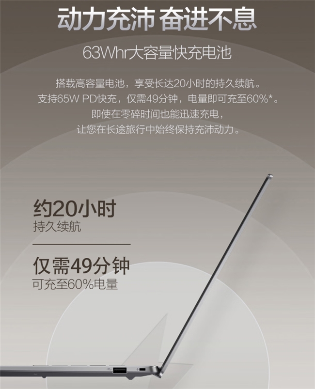 续航方面,得益于Lunar Lake Ultra5处理器的架构设计和功耗控制,这一代破晓6Pro不仅能为用户提供充沛性能,还兼顾了更加持久的续航。它内置63Whr大容量快充电池,至高实现20小时的续航,支持65W PD快充,仅需49分钟,电量即可充至60%,能让你在出差及旅行中也能无忧办公,碎片化时间即可快速回电。