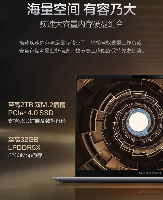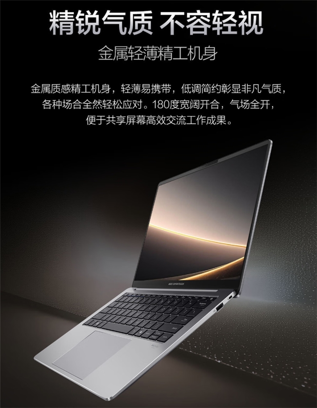当用户需要参与行业研讨会、商务洽谈、进行客户拜访时,华硕破晓6 Pro的外观也相当出彩。其采用合金银金属机身,A面贴有Asus Expertbook铭文LOGO,时尚简约,质感出众,既凸显商务人士的专业气质形象,也展现出用户对细节和品质的极致追求。