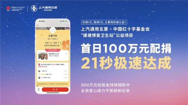 今年世界红十字日之际,上汽通用五菱更是以“21秒配捐100万元”的实际行动,大力支持“援建博爱卫生站”公益项目。