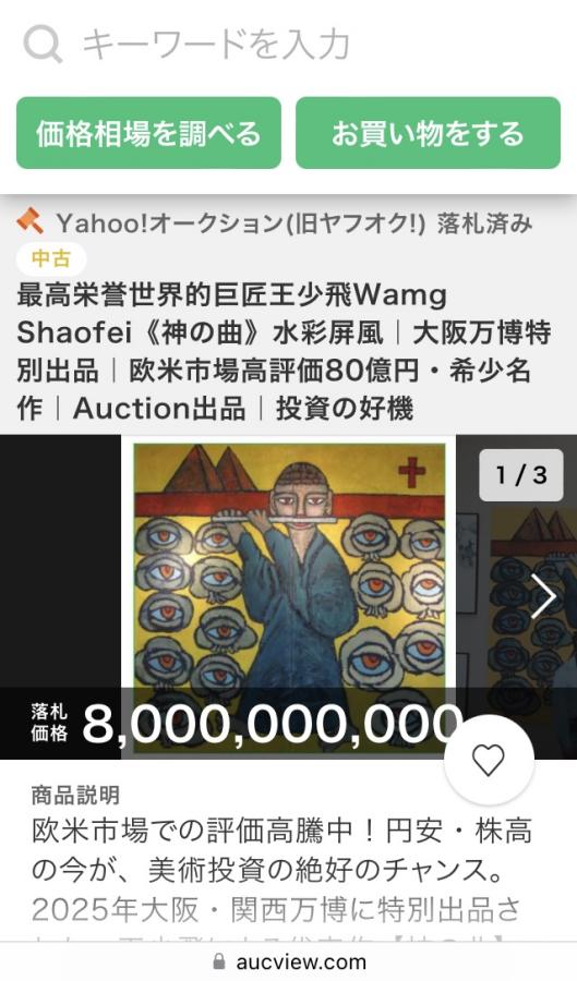 据介绍,《神曲》曾通过多国艺术专家联合评估,并在2025大阪关西世博会场馆中以荣誉展出作品身份亮相,获得高度评价。相关艺术投资团队透露,他们长期关注该作品的市场动态,意外于9月18日发现其已被拍出消息,震惊业界。据传买家为欧洲收藏家。雅虎拍卖(Yahoo Auction)作为全球知名的日本国际拍卖平台之一,此次拍卖引起业内广泛讨论。尽管《神曲》的市场评估价高达1亿美元以上,但由于出品方并未充分了解其国际估值,拍卖过程中也没有进行竞价抬升,最终被藏家以近半价购得,可谓“天赐良机”。