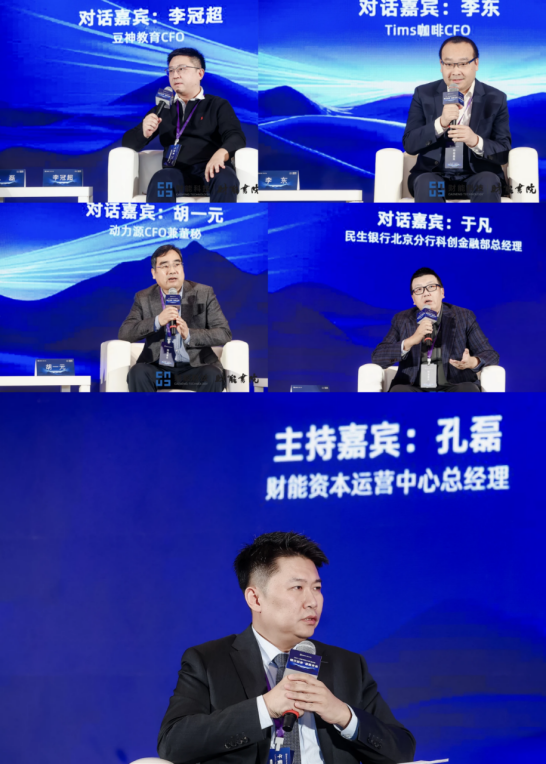 参与高峰对话之《CFO如何助力企业资本运作》的对话嘉宾包括:豆神教育CFO李冠超先生,Tims咖啡CFO李东先生,动力源CFO兼董秘胡一元先生,民生银行北京分行科创金融部总经理于凡先生。本场高峰对话由财能资本运营中心总经理孔磊先生担任主持人。四位对话嘉宾结合所在行业和企业,从不同视角分享了对当前资本市场的体感,并针对企业破产重整、SPAC、A股再融资等展开深度探讨,为CFO助力企业资本运作提出重要建议。