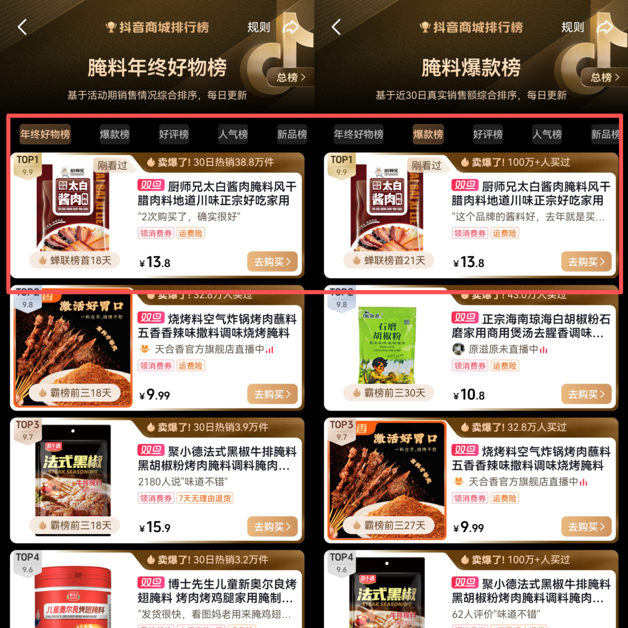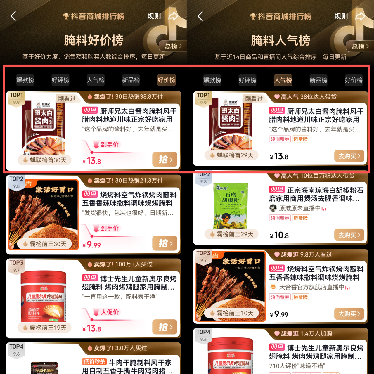 厨师兄太白酱肉腌料自2023年新品上市以来,一举爆红,在当年度抖音平台播放量达到8千万以上,迅速成为爆款产品。此后连续3年均在抖音平台酱肉腌料类目排行中名列前茅,截止现在累计销量已突破在1千万袋以上,深受广大用户欢迎,开辟了冬调产品类目的一个新赛道,并凭借其卓越的市场表现引领了冬调细分品类的发展。